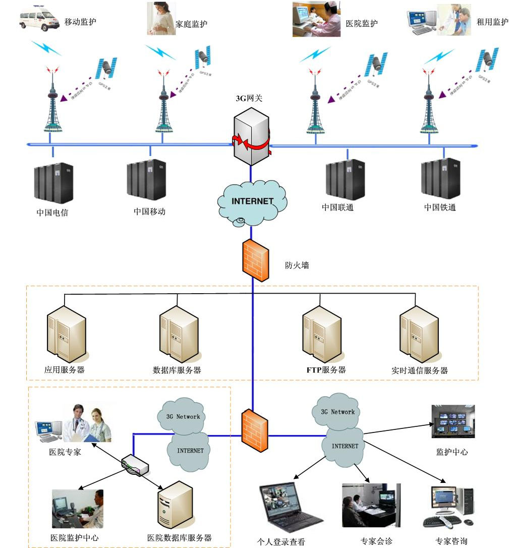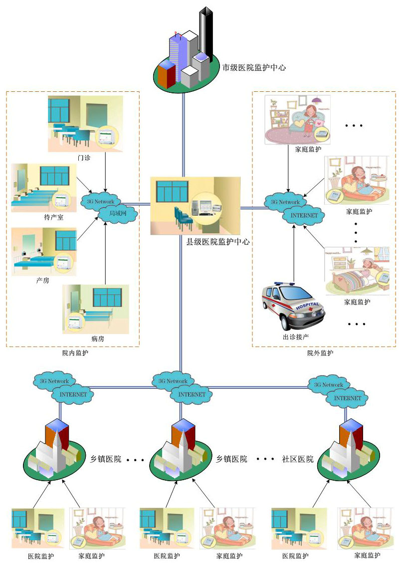 無(wú)線(xiàn)遠(yuǎn)程母嬰監(jiān)護(hù)網(wǎng)絡(luò)系統(tǒng),可同時(shí)將縣級(jí)醫(yī)院與多家鄉(xiāng)鎮(zhèn)醫(yī)院、社區(qū)醫(yī)院及家庭進(jìn)行聯(lián)網(wǎng),孕婦在鄉(xiāng)鎮(zhèn)醫(yī)院、社區(qū)醫(yī)院及家庭監(jiān)護(hù)的心電、血壓、血氧飽和度、脈搏心率及胎兒的瞬時(shí)胎心率、宮縮壓力、胎動(dòng)等參數(shù),同時(shí)無(wú)線(xiàn)遠(yuǎn)程實(shí)時(shí)傳輸?shù)娇h級(jí)醫(yī)院,實(shí)現(xiàn)遠(yuǎn)程監(jiān)護(hù)、遠(yuǎn)程診斷,不受時(shí)間空間距離制約。對(duì)同一個(gè)醫(yī)院,可實(shí)現(xiàn)門(mén)診、監(jiān)護(hù)室、病房、分院、樓層距離遠(yuǎn)聯(lián)網(wǎng)需求和資源共享。